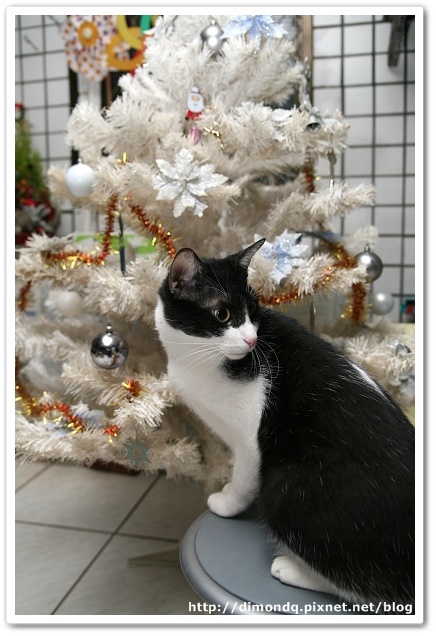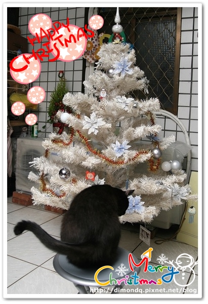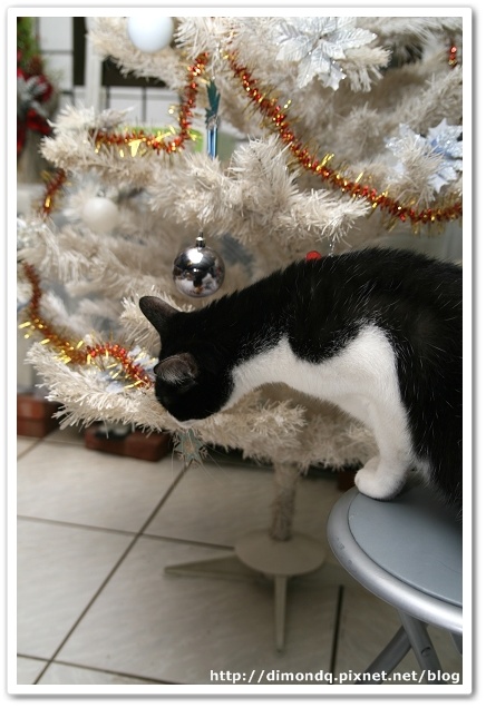 ▲邊裝飾還要邊阻止貓咪們湊熱鬧,好不容易大功告成,繞上新買的彩色燈泡~哇!超有氣氛