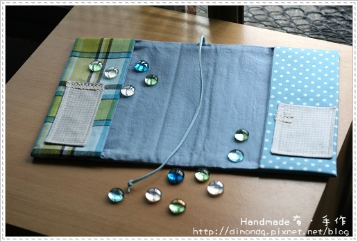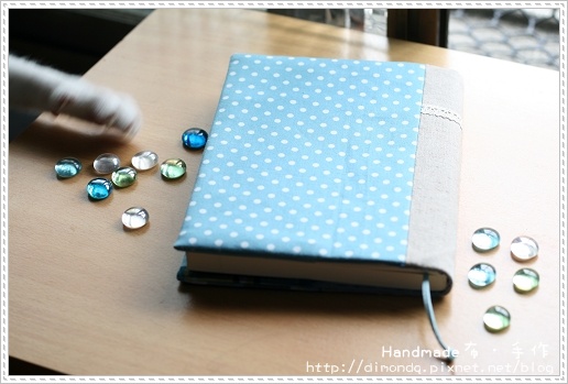 ▲若是中翻的書,則封面就是藍底白水玉的這面了,本來這面要繡上圖案,結果...做得太順手,小白老師忘記告訴我該在哪個步驟繡,之後又不想打開書頁看得到繡的痕跡~哈!所以我決定下次再學手繡