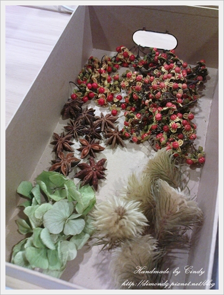 ▲乾燥花們有~綠繡球、毛筆花、蔓梅擬和八角!是的,就是滷肉要加的八角XD