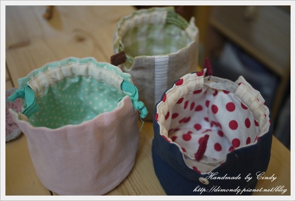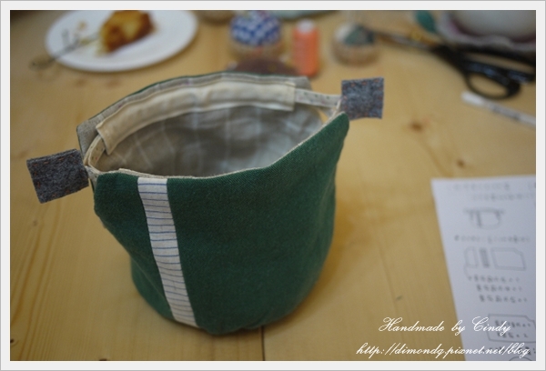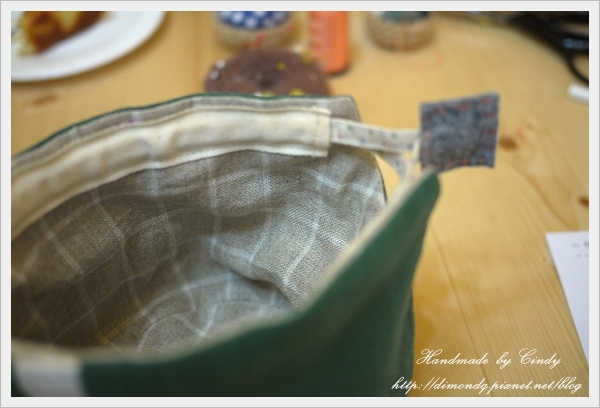 ▲一邊聊天一邊車車車、縫縫縫,還算快的完成了束口袋(中間一度忘了留返口,不過老師沒發現耶!)