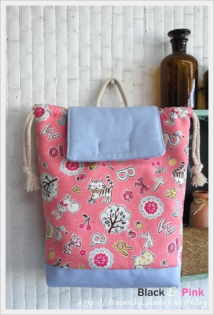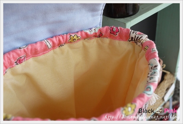 袋口是束口的方式,這樣小朋友使用也能上手,不過可能是我用的布偏厚,又加了襯,變得要用很大的力氣才束得緊...所以它變得不適合小朋友用了啦!除非不束口~哈哈!本來想說做好要送給家有女童的朋友,結果...小失敗,只好再接再厲再做一咖了!